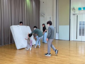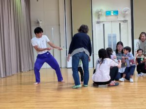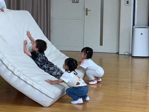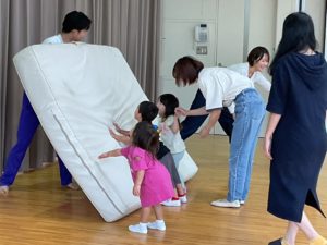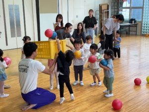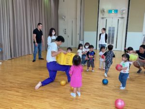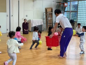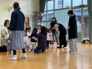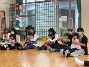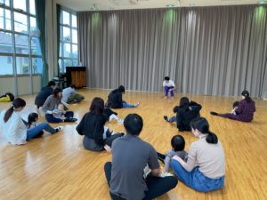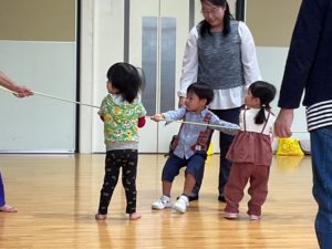 最初は親子で触れ合い遊び『バスにのって』をしたり、準備体操をしたりして遊びました🚌