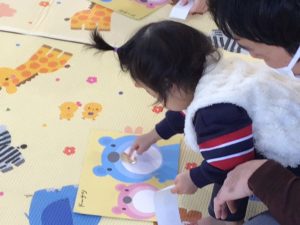 ドーナツのシールをくまさんのお口にペタッ🍩